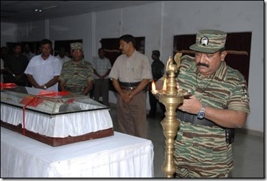 Since LTTE killed Mr Sivanesan, they must have planned it well before that fateful day in November last year when VP got killed. They must have planned everything so precisely that they knew that VP would be killed before Mr Sivanesan and managed to stage this fake 'garlanding' ceremony well before all these tragedies occurred. We hear from reliable sources that the LTTE borrowed the wax worker from 'Madame Tussauds' in London to make a life-size dead body ( Which could probably be dismantled into small bits and re-assembled) of Mr Sivanesan in early October and shipped it through 'small boats' to Tamil Eelam. They then, staged a beautiful ceremony which they took photographs of and filed them for future propaganda use. Now that they have successfully executed the plan to assassinate Mr Sivanesan, the pictures are being published for propaganda mileage. It is of course obvious from the quality of the pictures that they have been idling in a file for a considerably long time and thus have faded a wee bit.